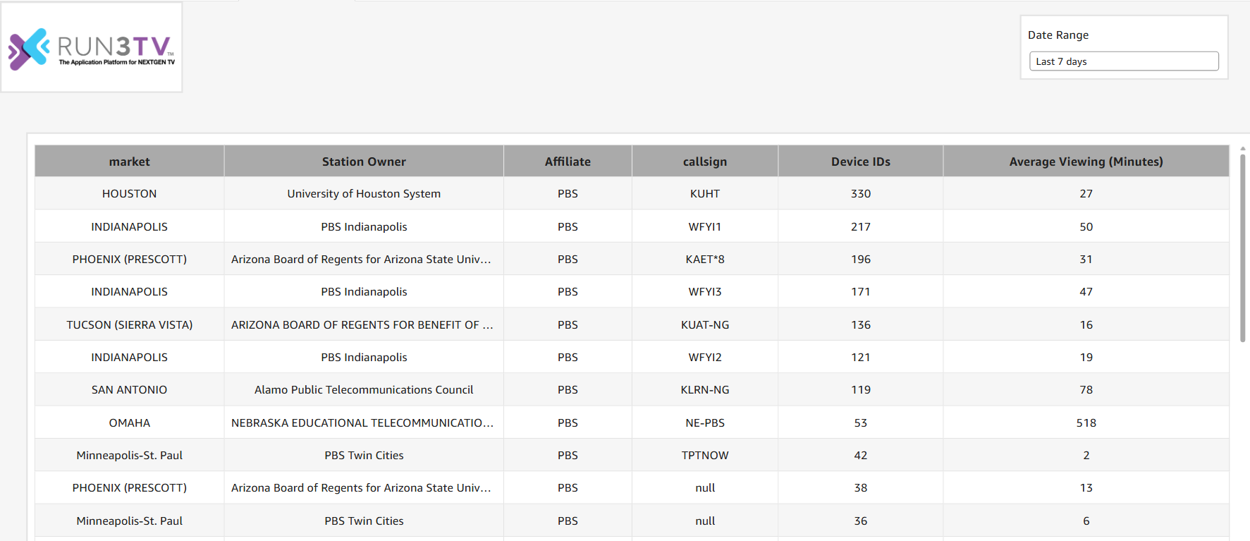 This report provides an overview by market, callsign & source and shows the number of unique devices and and average viewing duration. Initially sorted by the number of unique devices, this list can be re-ordered by clicking anywhere on the header row and selecting the column to sort by.