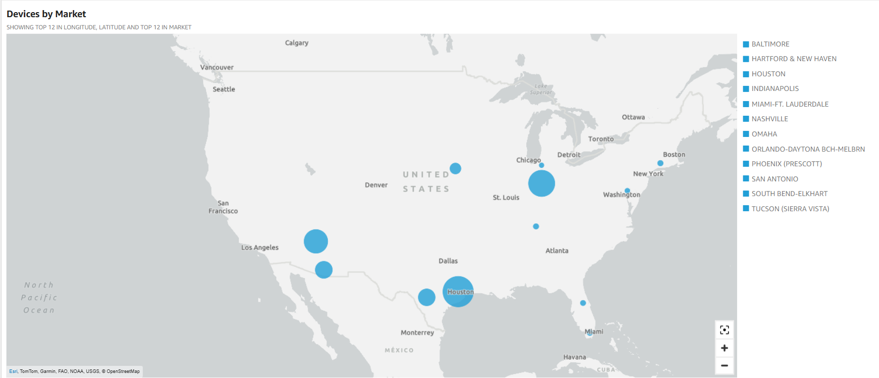 Hovering over any given market (represented as blue circles) shows the longitude, latitude, DMA name and unique device count. Scrolling zooms the map in and out.