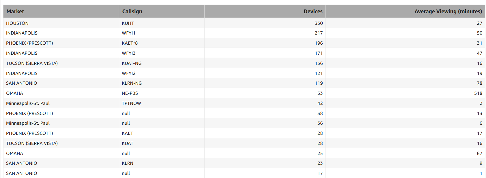 The National Report shows an interactive map of unique devices by market with an accompanying table showing the number of unique channels in the market and the reported callsigns detailing the unique devices and the average viewing duration over the reporting period.
